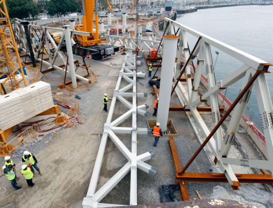 Una vez sea transportado el grueso de la estructura metálica (la celosía de borde del edificio Oeste, de 77 metros de longitud, que llegó a finales de abril y que ya está en el Muelle de Albareda), comenzará su montaje en la obra. Los trabajos contemplan el ensamblaje, en el suelo, de las distintas piezas transportadas para, una vez conformada cada una de las celosías, proceder a su izado sobre los pilares, lo que dará lugar a una estructura reticular en tres dimensiones que conformará el esqueleto del edificio, trabajo que, según las previsiones, se realizará este verano.