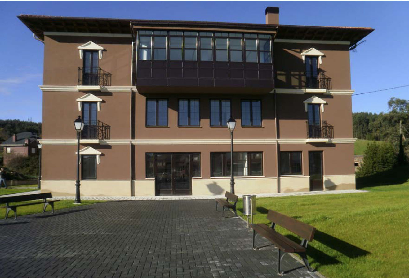 - Cerramiento fachada: Predominio de zonas revestidas en mortero de cemento acabado en pintura petrea. Molduras, vierteaguas y cornisas en hormigón prefabricado. Carpintería exterior de aluminio lacado color.