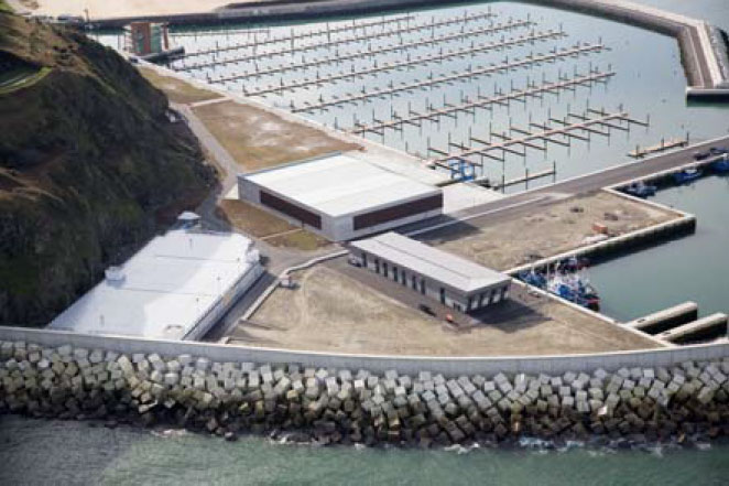 - En la zona central de la superficie del nuevo puerto se proyecta una isla y un contradique interior que delimita el canal de acceso a las zonas pesqueras al tiempo que protege a la dársena deportiva de los oleajes procedentes del exterior y da cabida al Club Náutico y a la Capitanía Marítima. Para acceder a ella se ha proyectado un pantalán de hormigón longitudinal de 24 m de anchura apoyado sobre pilas que la une a la zona de tierra y que, además, separa la zona deportiva de la pesquera sin suponer una barrera al paso del agua.