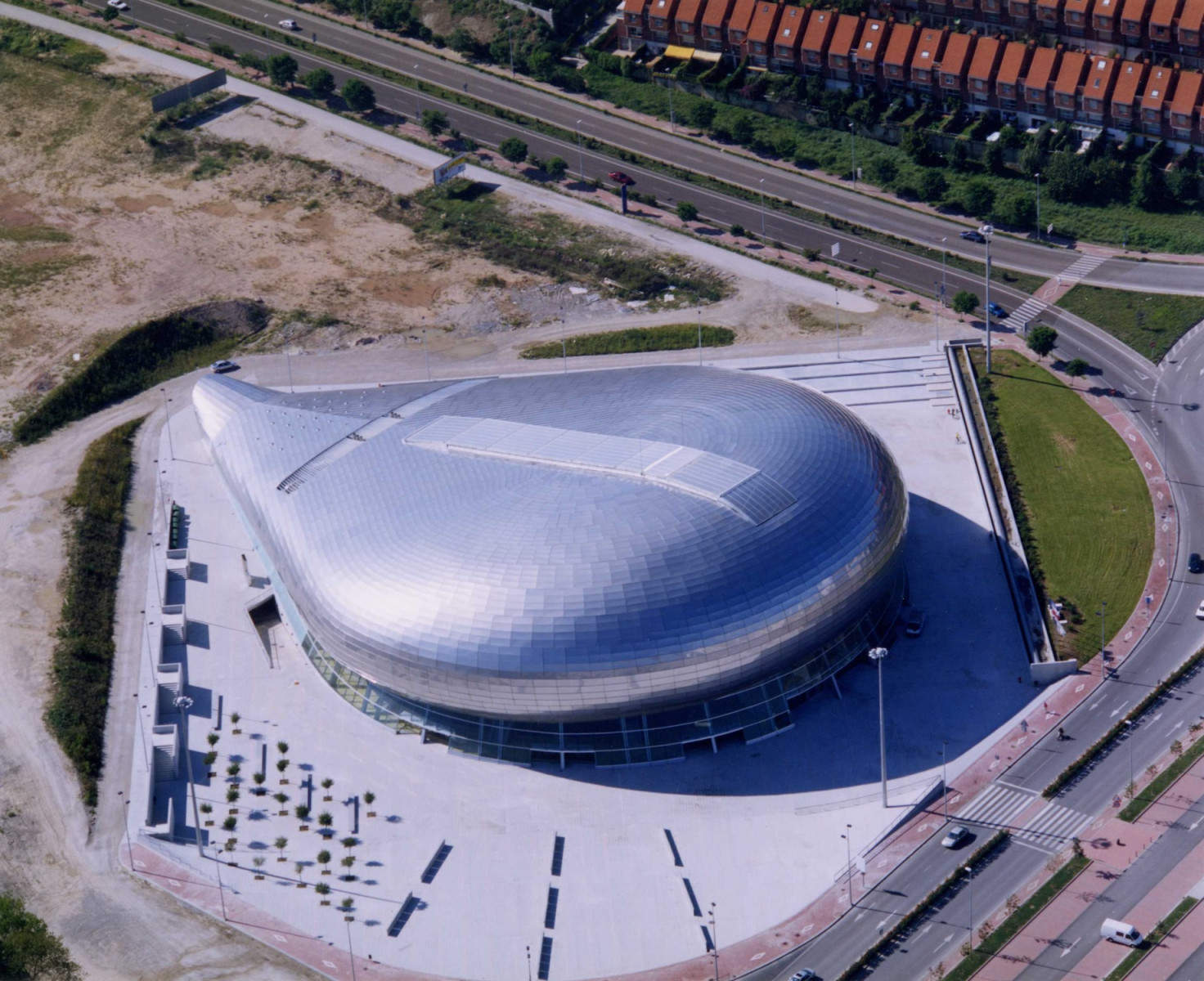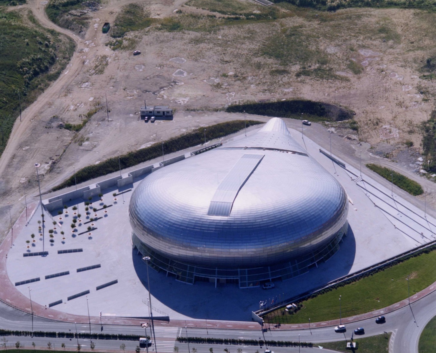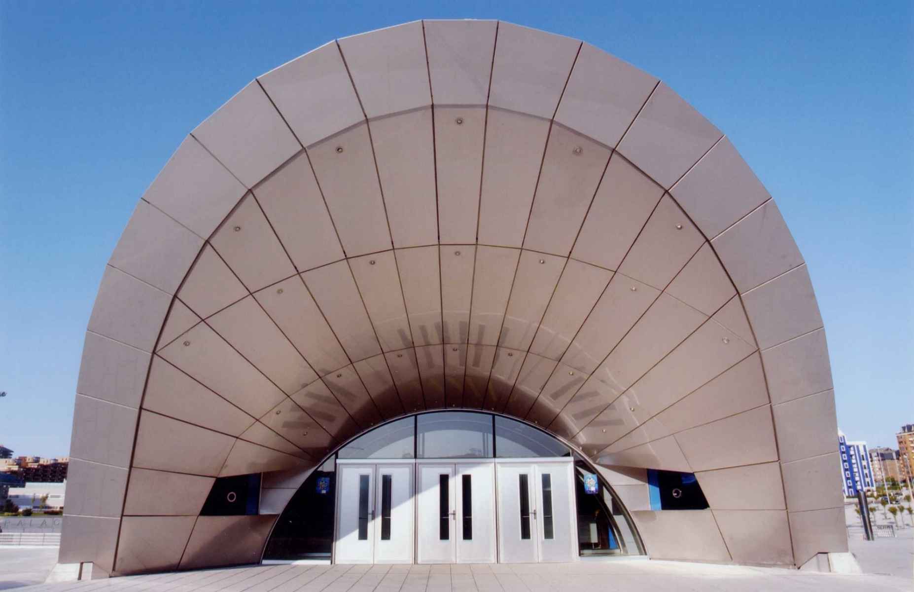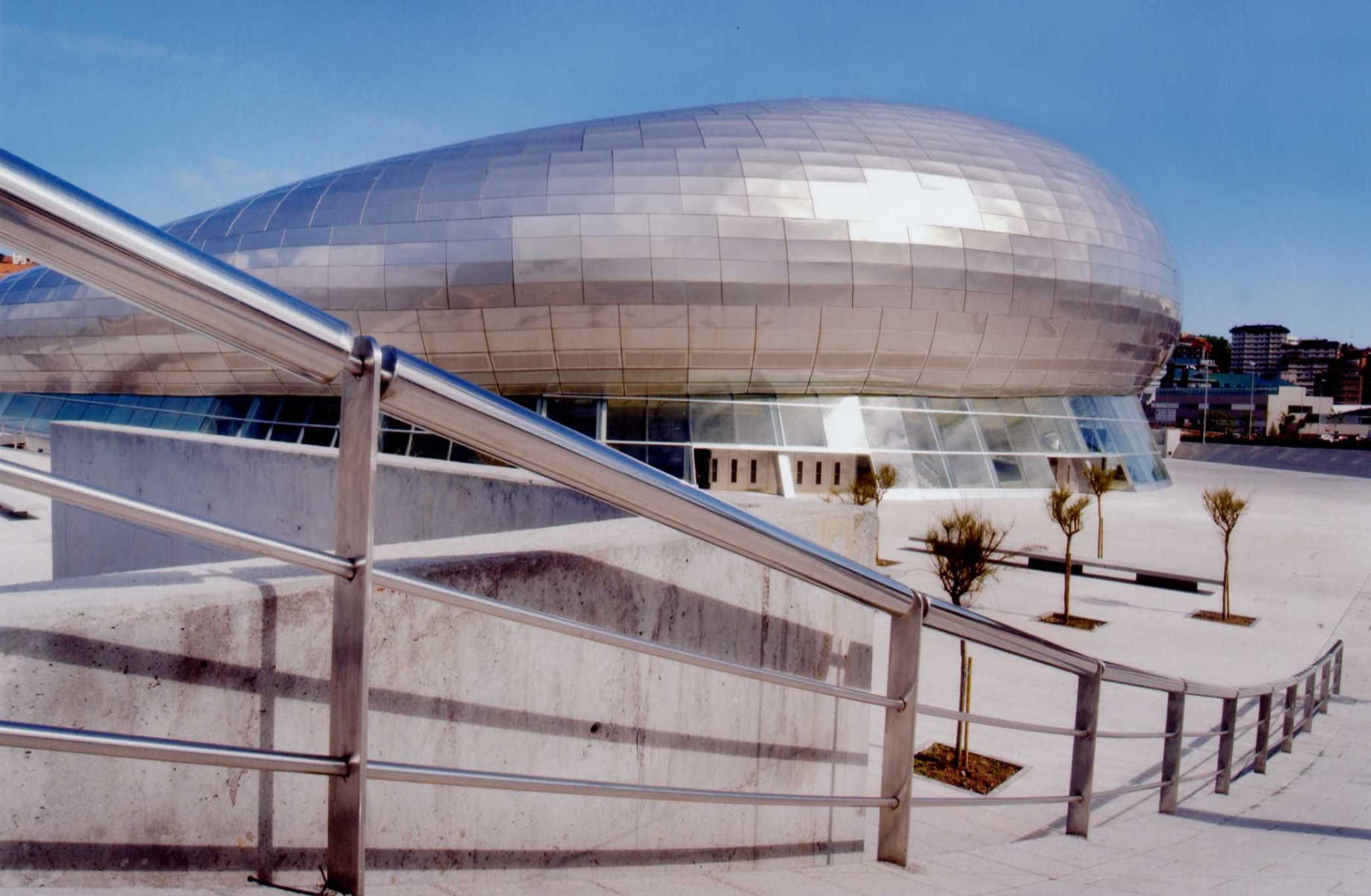 - Combina una estructura de hormigón y una cubierta de acero inoxidable con una forma recordando la de una ballena.