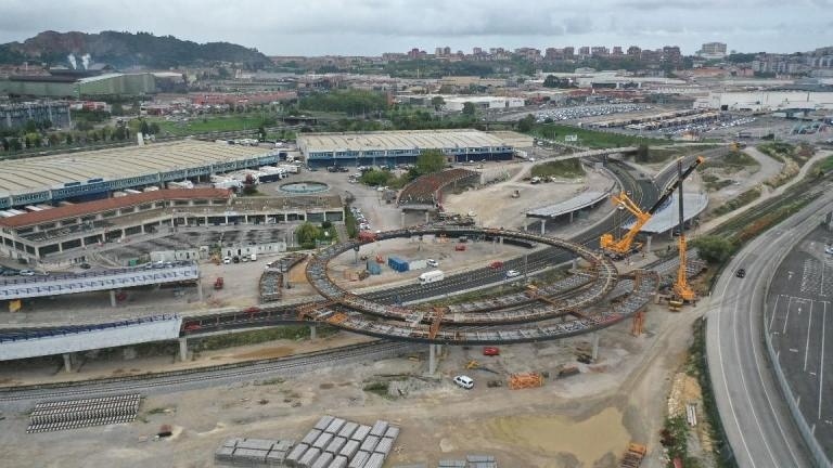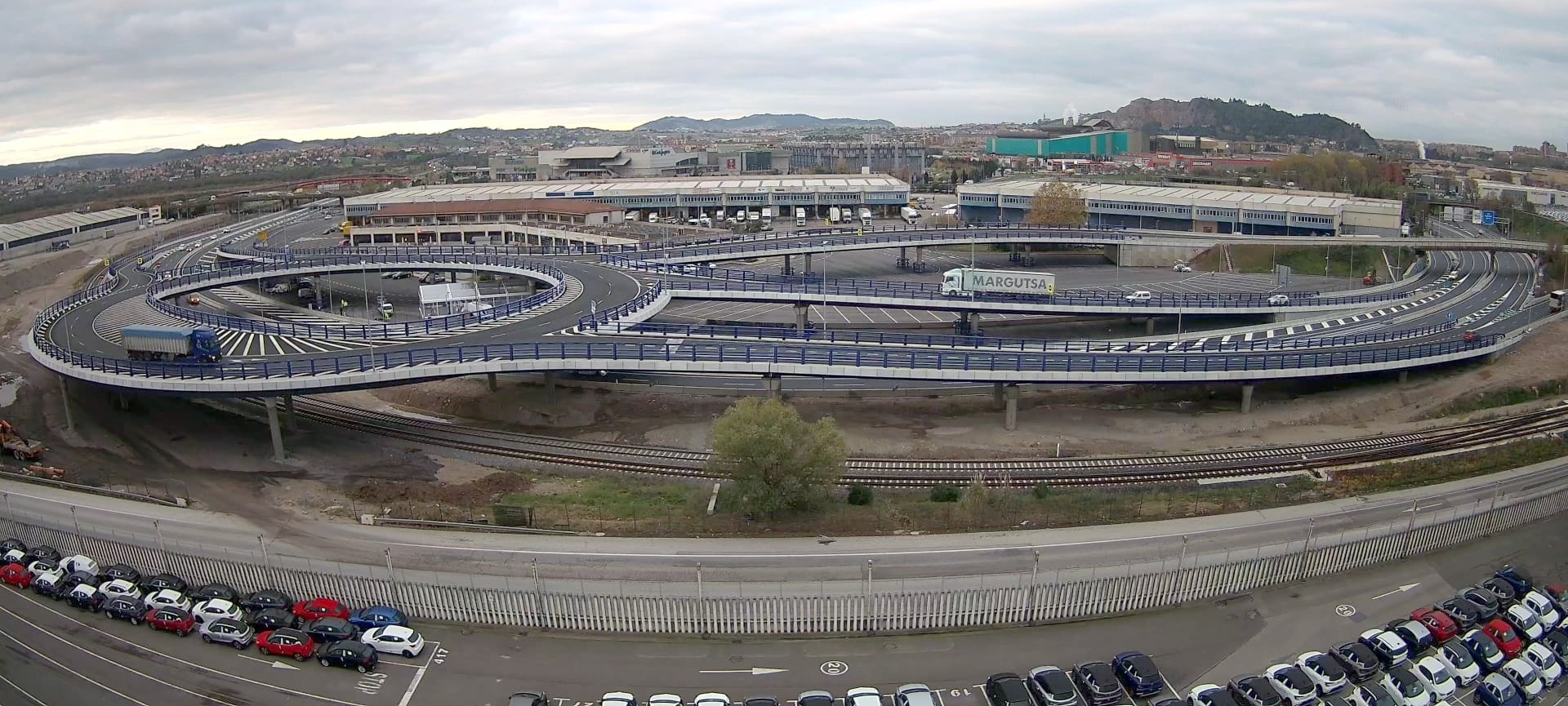 - La glorieta principal elevada de 103 metros de diámetro y un ancho medio de 15 metros, se resuelve mediante un tablero mixto constituido por dos cajones metálicos y una losa superior de hormigón que minimiza las cargas transmitidas a la cimentación y cuya construcción reduce las afecciones al tráfico de la autovía A-67 y al servicio del FF.CC. Para posibilitar la circulación de vehículos especiales, el tablero dispone de un tercer cajón sobre las vías del ferrocarril de acceso al Puerto, dotándolo de un sobre ancho para permitir el paso de vehículos especiales para transporte de palas de aerogeneradores.