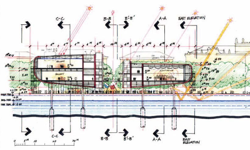 - La superficie ocupada en planta baja se devuelve a la ciudad con una plaza elevada y una pasarela dispuesta en voladizo sobre el mar.