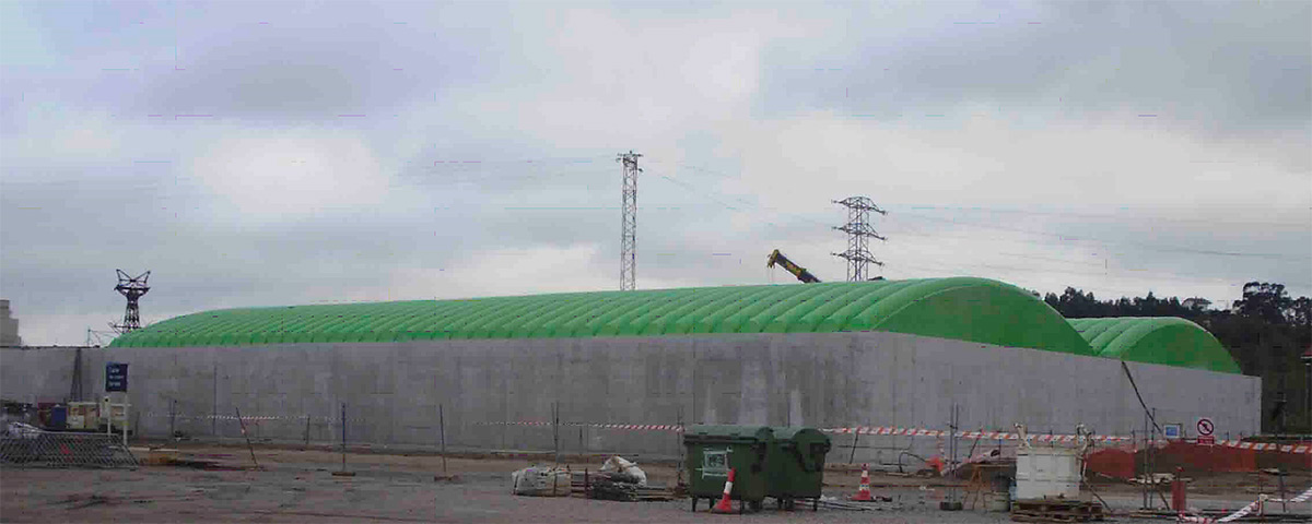 Cubierta modular de poliéster reforzado con fibra de vidrio configurada por piezas en forma de omega curvada con un radio de 23m y un ancho de 1m.