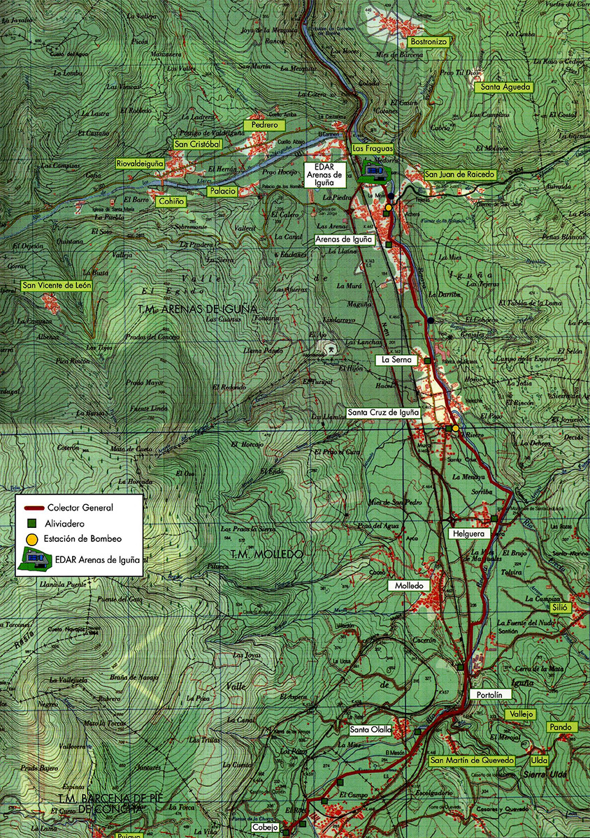 - La obra consistió en la construcción de una EDAR y del Colector Interceptor General, de una longitud de 9.710,10 m., siguiendo el Valle formado por el río Besaya. El trazado atraviesa distintos núcleos de los términos municipales de Bárcena de Pie de Concha, Molledo y Arenas de Iguña, recibiendo sus vertidos. Cruzado el núcleo de Arenas de Iguña, el colector desemboca en una parcela cercana al río, dónde se ubica la EDAR.